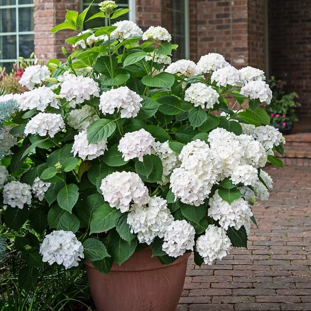 The white flowers of Blushing Bride Reblooming Hydrangea are a great choice for the front of the house and won’t clash with orange and red toned bricks. Image courtesy of Bailey Nurseries.