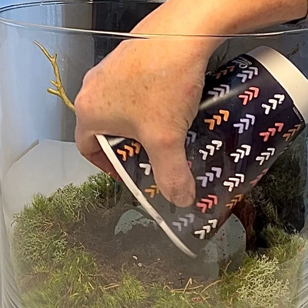 Since there are no drainage holes in your container, be careful not to overwater - how to make a Halloween terrarium last longer starts with avoiding root rot! A little water goes a long way, so take it slow and water just a little bit at a time.