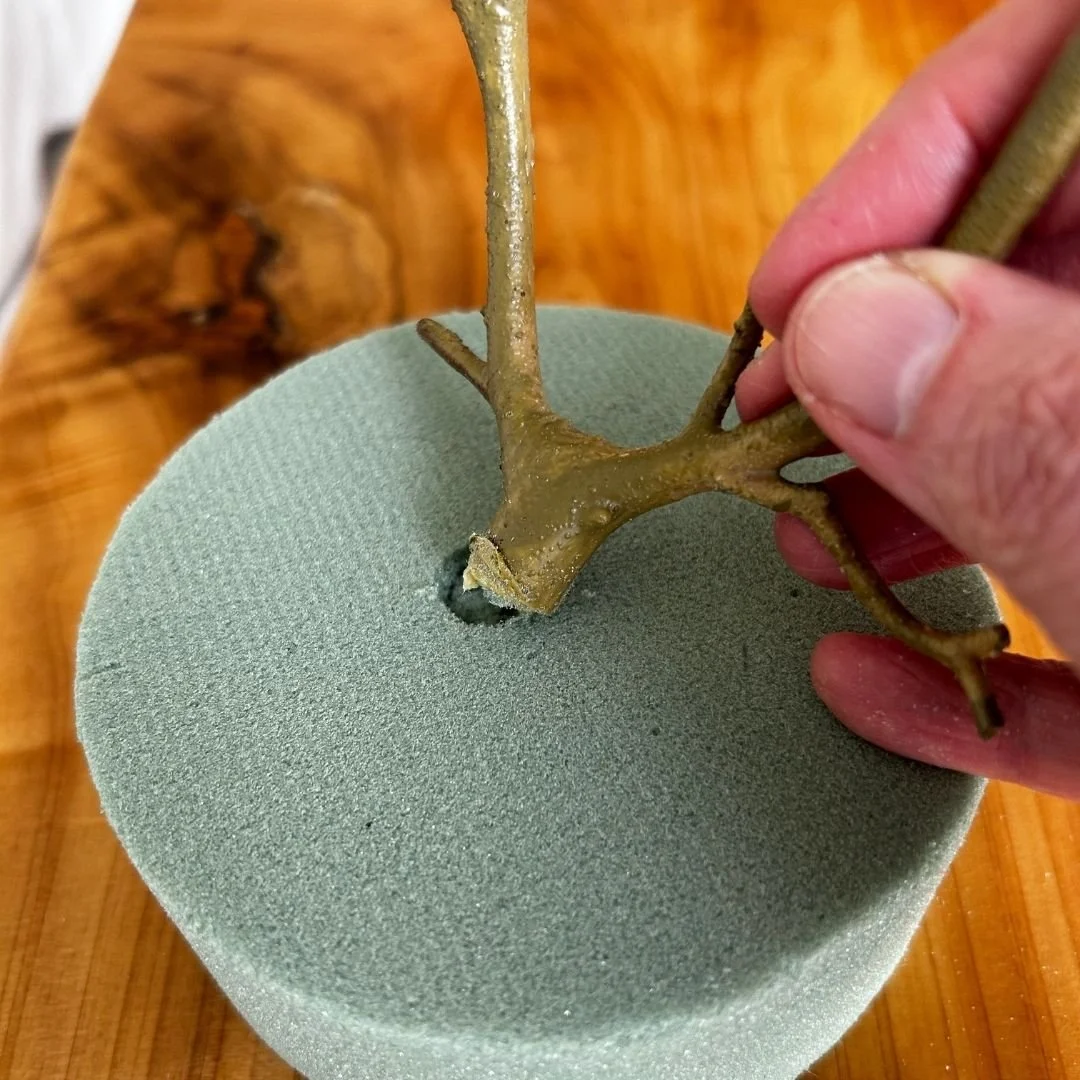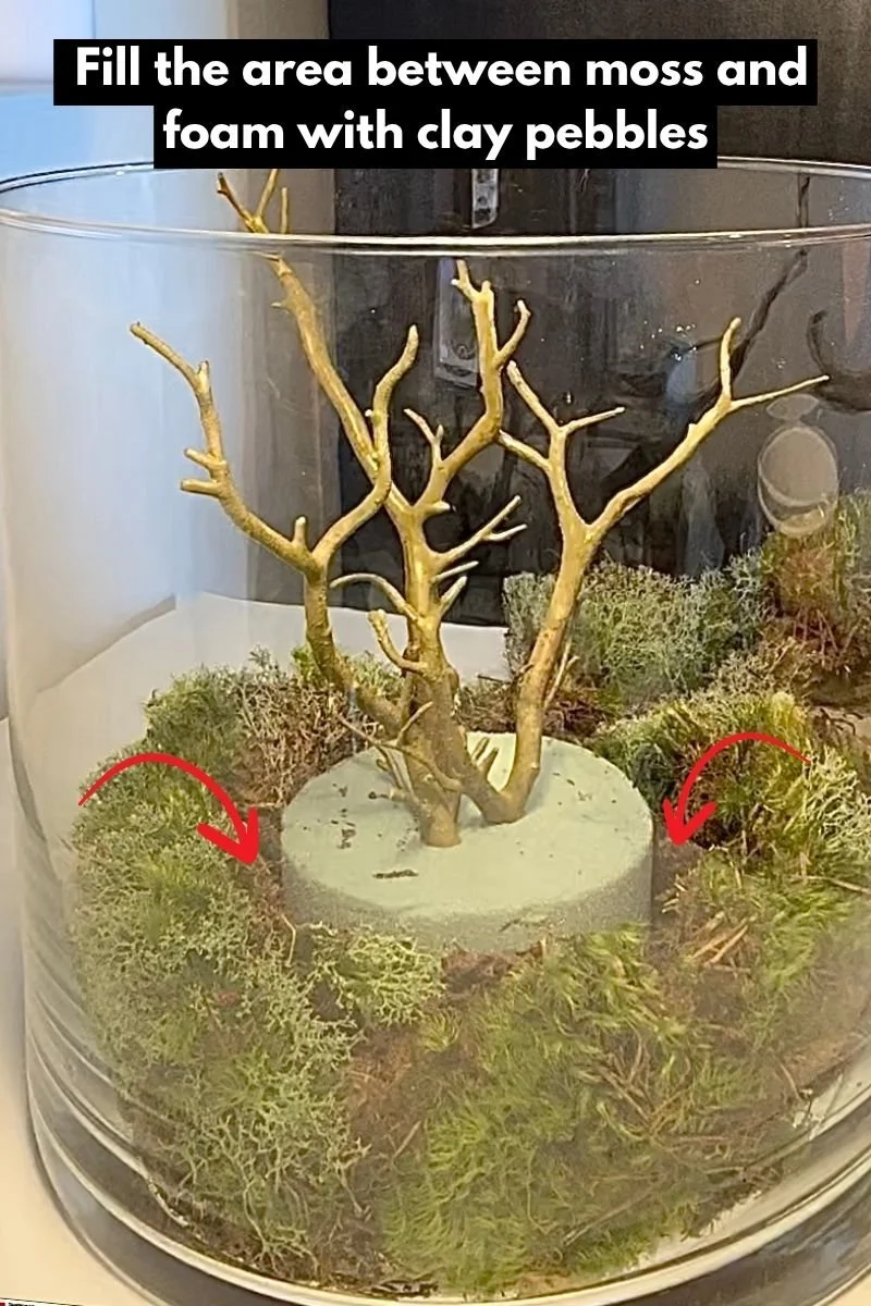 2. Place the piece of dry foam with the branch tips in the center of the moss ring. Then, add a thin layer of clay pebbles in the empty space between the foam and the moss to help with drainage.