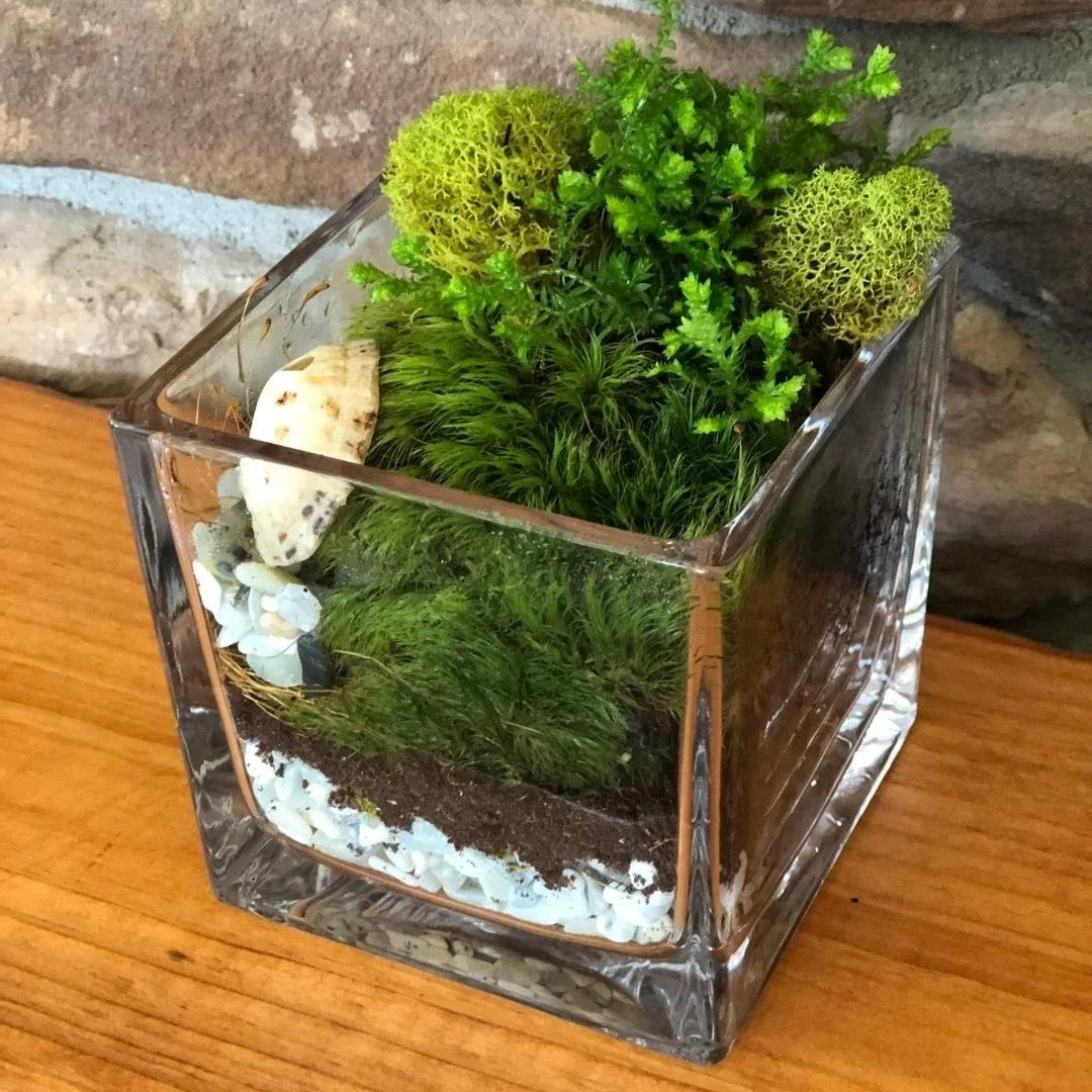 Get step-by-step instructions for creating a mossy green open terrarium in a vase.